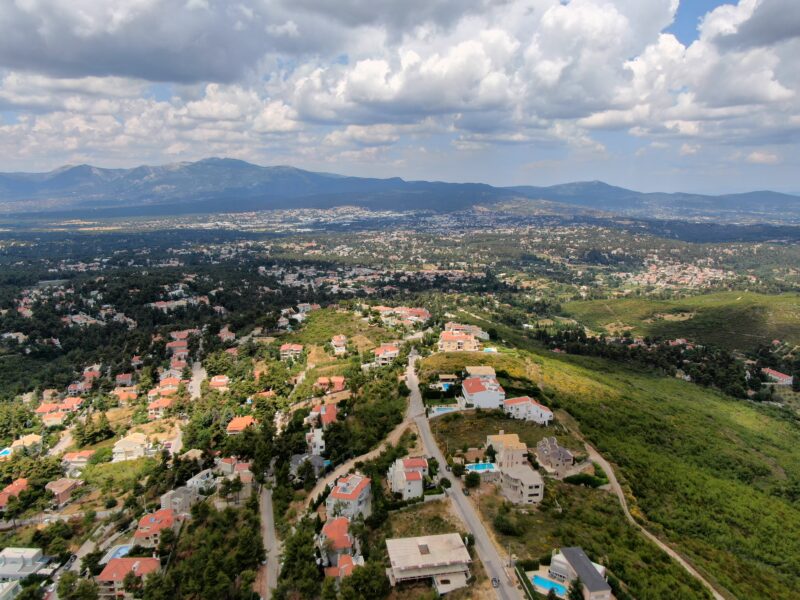UNIQUE sloping and amphitheatrical lot of land of 818sqm, on the tip of the hill on Arkadias street of Dionysos. The lot owns a panoramic view of the entire woody Dionysos area, till the eye meets with the horizon of Attica's Cirque. It has a structure factor of 0,4, you may build up to 327sqm and a coverage factor of 20%. The front view measures 26m on the street and the maximum height allowed is 9m with roof. Thanks to its steep slope, one may build 2 basements on different levels. The lot has a advantageous orientation facing southeast and thus exposed to lots of natural light all day long and viable to build a pool that is going to be sun washed. Fantastic opportunity for those that are all for VIEWS, VIEWS, VIEWS, nature and clean air!